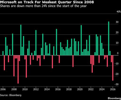 (Bloomberg) -- Microsoft Corp. is at the intersection of two troubling trends roiling the technology sector, which has the stock on track for its worst quarterly performance since the global financial crisis two decades ago.First, the software giant is doubling down on capital expenditures as Wall Street increasingly asks when investments in artificial intelligence infrastructure will produce more dramatic payoffs in revenue growth. And second, investors are selling software stocks over fears th