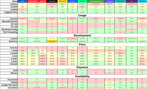 Also, heat map conditional formatting favoring free is a bad metric. Free VPNs steal data, and Tor isn’t a VPN, so this skews all the other paid options to seem negative.