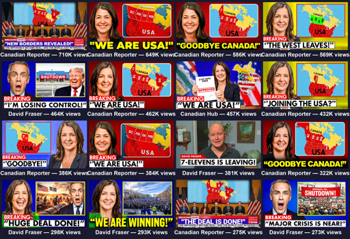 Deep@mander.xyz to Technology@lemmy.worldEnglish · 1 day agoSlopaganda: Coordinated network of inauthentic YouTube channels are pushing secession to Canadians at Alberta and even U.S. annexation.plus-squarewww.cdmrn.caexternal-linkmessage-square84linkfedilinkarrow-up1563arrow-down16